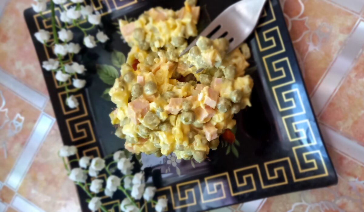 3. Не забудьте про горошек — добавьте его к остальным ингредиентам и перемешайте. Напоследок заправьте салат майонезом и, если нужно, добавьте немного соли для вкуса.