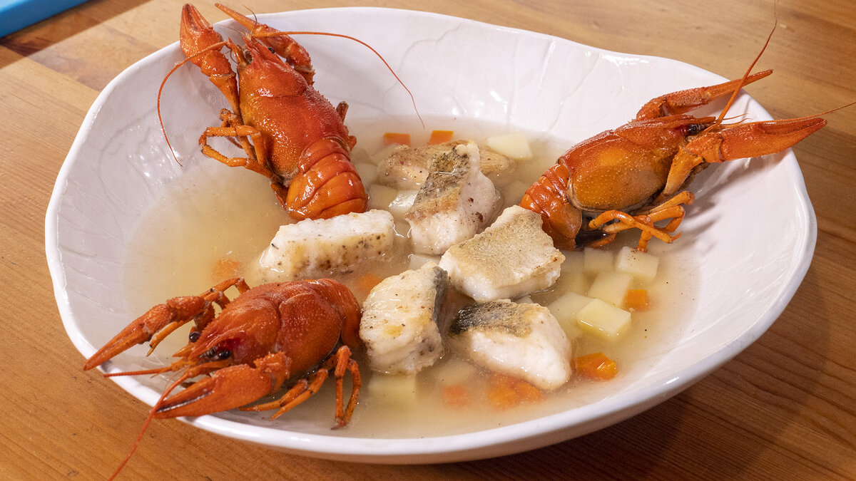 Процедите бульон, добавьте картофель, морковь и оставшуюся мелко нарезанную луковицу. Когда жидкость закипит, отправьте в кастрюлю раков. Через 10 минут можно выключить.
