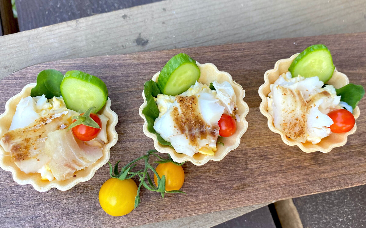 На дно тарталеток выкладываются листики руколы или другого салата, чтобы избежать размокания. Затем в каждую тарталетку помещается яичная начинка, сверху выкладываются кусочки минтая, дольки огурца и помидоры. Декорировать закуску можно на любой вкус, это позволит привнести оригинальность в оформление.