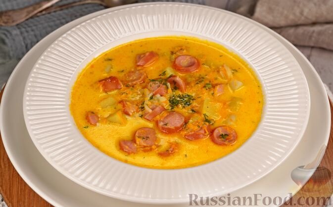 - Сырный суп с вермишелью и сосисками – идеальное решение в те дни, когда времени на готовку не так много. Плавленый сыр придаёт нежность, а сосиски добавляют сытности.