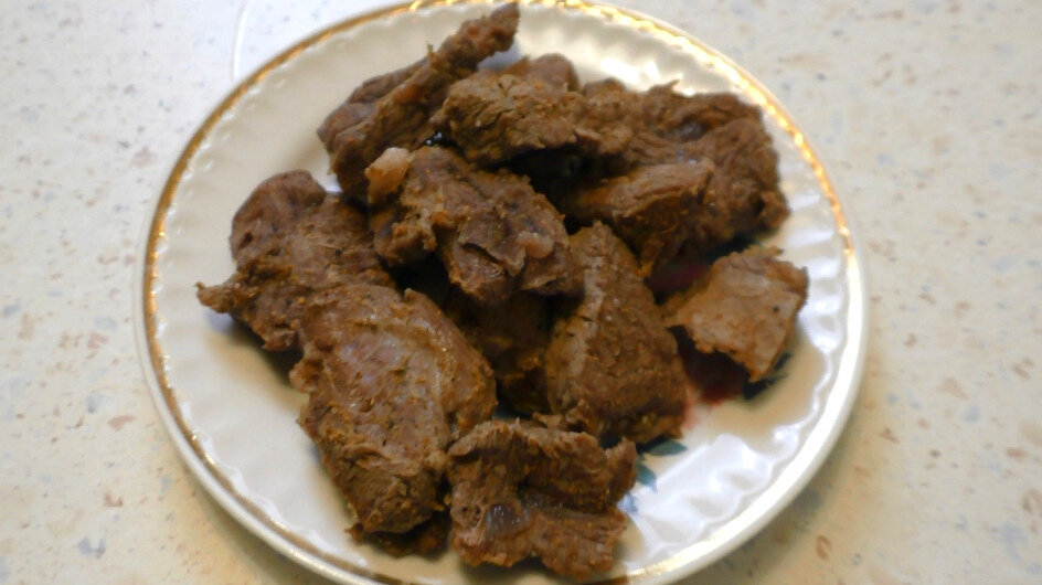 Говядину нарезать на небольшие кусочки, примерно 7 на 7 см, чтобы ускорить процесс готовки и облегчить трапезу.