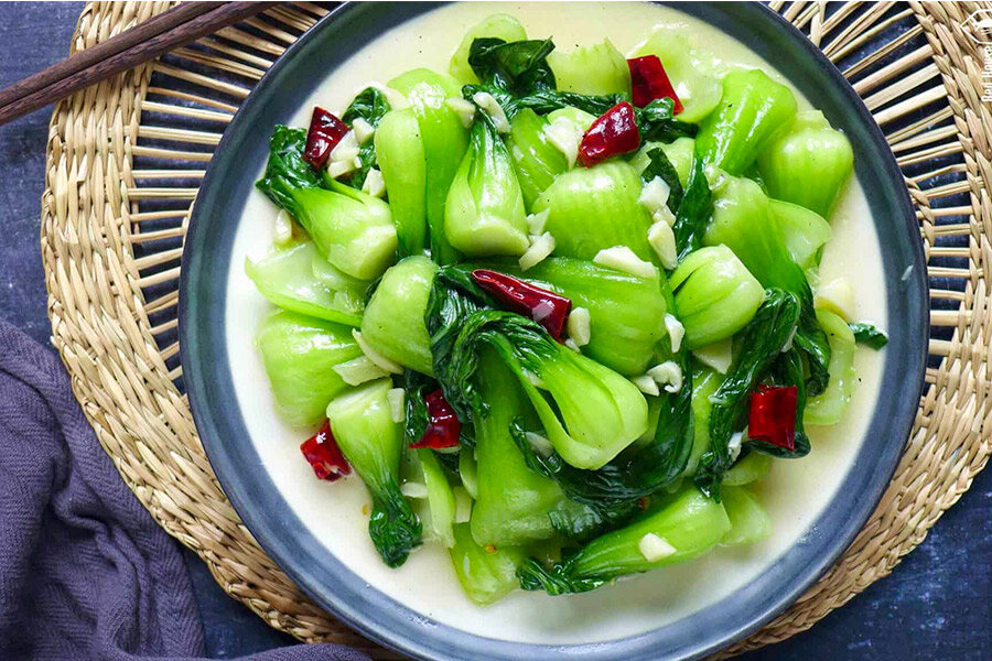 Бок-чой разрезать вдоль на половинки или четвертинки в зависимости от размера. Чили нарезать, а чеснок измельчить.В отдельной миске смешать кукурузный крахмал, соль и сахар, добавив столовую ложку воды.Большую кастрюлю заполнить водой и довести её до кипения. Добавить половину чайной ложки соли, затем опустить бок-чой. Бланшировать 20-30 секунд, после чего откинуть на дуршлаг.На сильном огне разогреть глубокую сковороду, добавить растительное масло. Всыпать чеснок и нарезанный чили, жарить до появления аромата (около 20 секунд).Добавить бок-чой, обжаривая его, помешивая на сильном огне, в течение 30 секунд.Влить подготовленную суспензию, предварительно перемешав её (крахмал может осесть). Тщательно всё перемешать и снять с огня.Приятного аппетита!