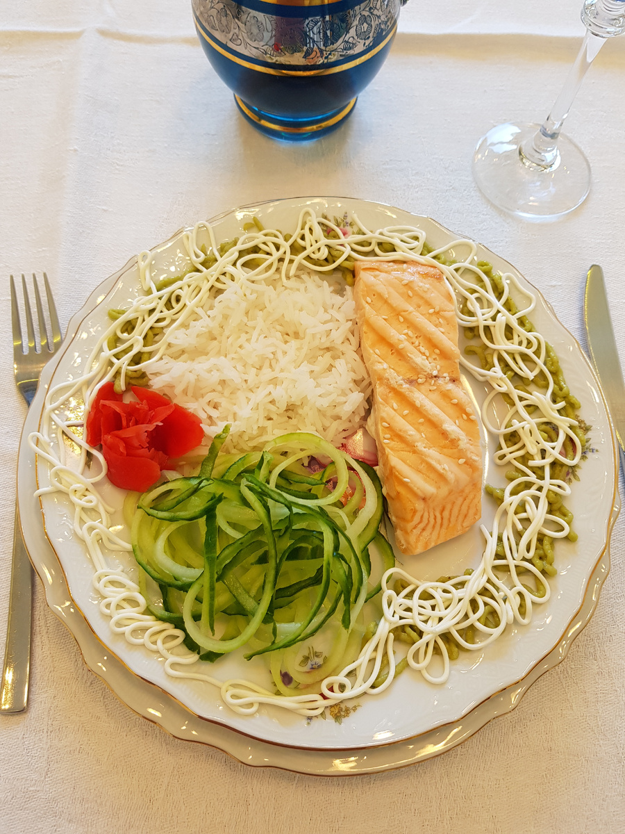 Пока рис варится, разогрейте гриль до 160 градусов Цельсия, смажьте его растительным маслом и запекайте сёмгу в течение 5 минут. Огурец нарежьте спиральной овощерезкой для красивой подачи.