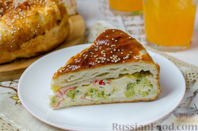 1. Крабовый пирог с брокколи и сыром: Слоёное тесто, сочная брокколи и нежные крабовые палочки образуют неповторимое сочетание. Это не просто пирог, а полноценный обед, который, при простоте готовки, станет вашим фаворитом на любой трапезе.