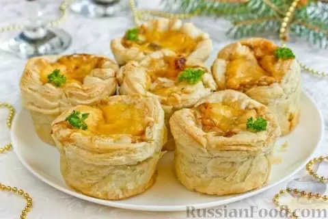 Жюльен в корзиночках — это не просто красиво, это невероятно вкусно! Маленькие корзинки из слоёного теста наполнены сочной начинкой из куриного филе и грибов в сливочном соусе, а сверху их щедро посыпают сыром для золотистой корочки.