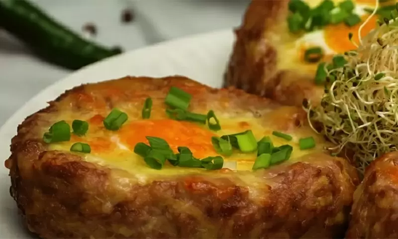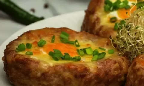 Разогреть духовку до 180°C и запекать котлеты в течение 30 минут. После этого натереть сыр, заполнить углубления в котлетах и разбить по яйцу сверху. Добавить немного соли и вернуть в духовку еще на 10 минут.