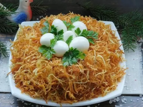 Каждый из этих шагов требует внимания и аккуратности, но итог обязательно оправдает затраченные усилия, превратив итоге обыденный обед в гастрономический праздник. Салат «Гнездо глухаря» станет изюминкой вашего стола и неизменно порадует гостей.