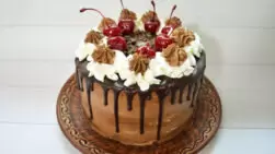 - Классический способ — равномерно покрыть торт кремом и украсить его «розетками» из сливок и вишенками. Готовый торт можно посыпать шоколадной стружкой;