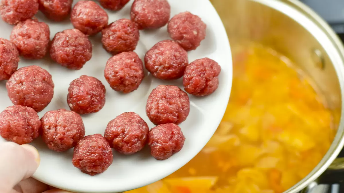 Из фарша сформируйте небольшие фрикадельки и аккуратно положите их в кипящий бульон.