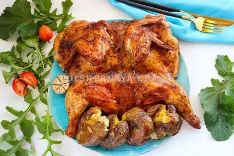 Курица трижды открывается вниманию: промаринованная смесь солёных и сладких нот пропитывает кожу, а затем равномерная раскладка по форме туши помогает запечься целиком без пересушивания. Небольшой штрих — разбивка вдоль грудки и легкое отбивание — делает тушку более гибкой для тепловой обработки.