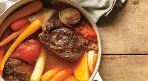 Обвязывают мозговые кости и мясо кулинарной нитью, чтобы они не потеряли форму. Говядину кладут на дно кастрюли, заливают водой и доводят до кипения. Пену убирают, затем добавляют лук с гвоздикой и пряные травы. Варят на медленном огне в течение 2,5 часов. Каждый вид овощей помещают в марлевый мешочек для равномерного приготовления. Когда овощи станут мягкими, их извлекают, а бульон процеживают. На тарелки выкладывают овощи, мясо, а в пиалы — горячий бульон.