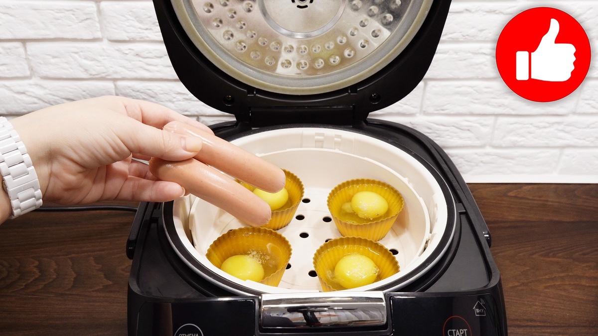 Чтобы создать это простое, но сытное блюдо, прежде всего, налейте холодную воду на дно чаши мультиварки. Установите корзину для пароварки сверху. В силиконовые формочки, размещенные в ней, разбейте яйца, предварительно посолив их. Между формочками аккуратно разместите сосиски для того, чтобы все ингредиенты соприкасались и получали одинаковую пару.