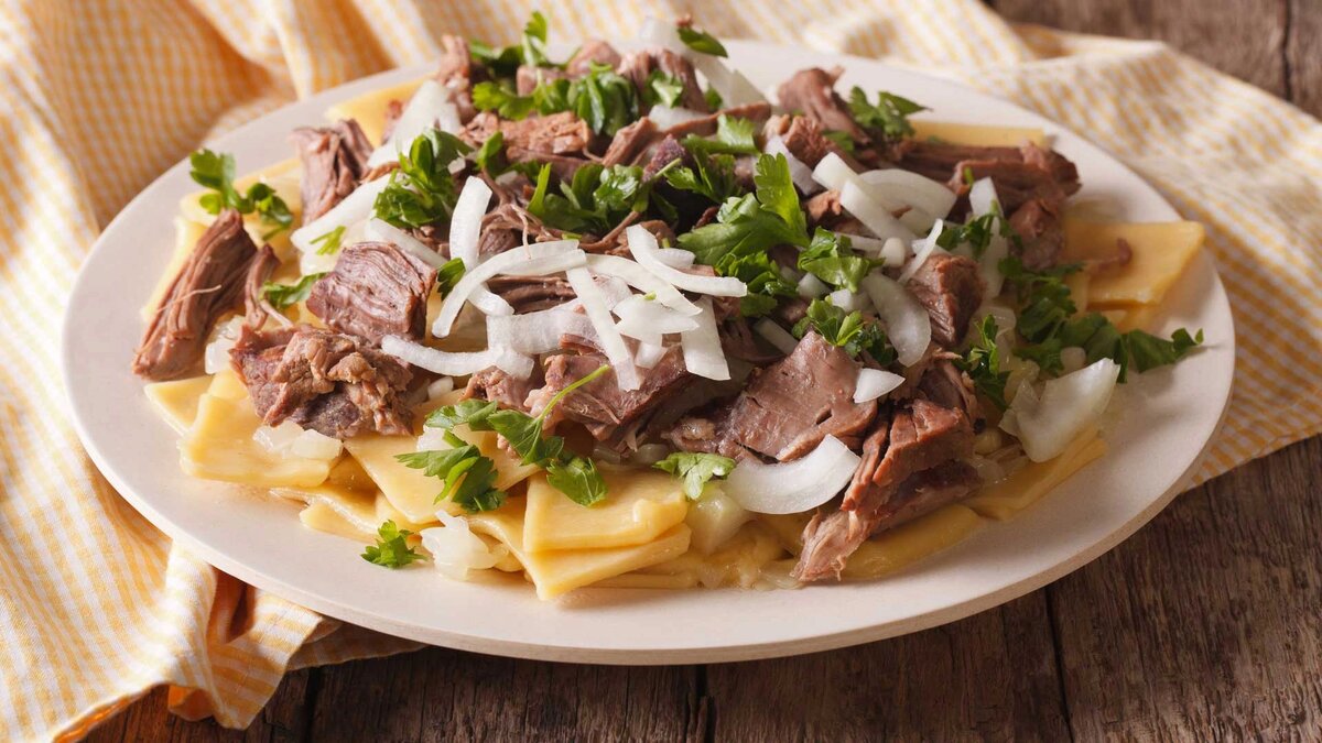 Теперь перейдем к лапше — важной составляющей бешбармака. Тесто должно быть эластичным и не липким, поэтому после замеса его стоит оставить на 30-40 минут для отдыха. Затем, раскатав тесто в тонкий пласт, его нужно нарезать на полоски. После этого будет обработка лука. Крупно нарезанный лук следует залить горячим бульоном, чтобы он «дошел» до состояния мягкости и прозрачности. Такой подход придаст ему богатый аромат.