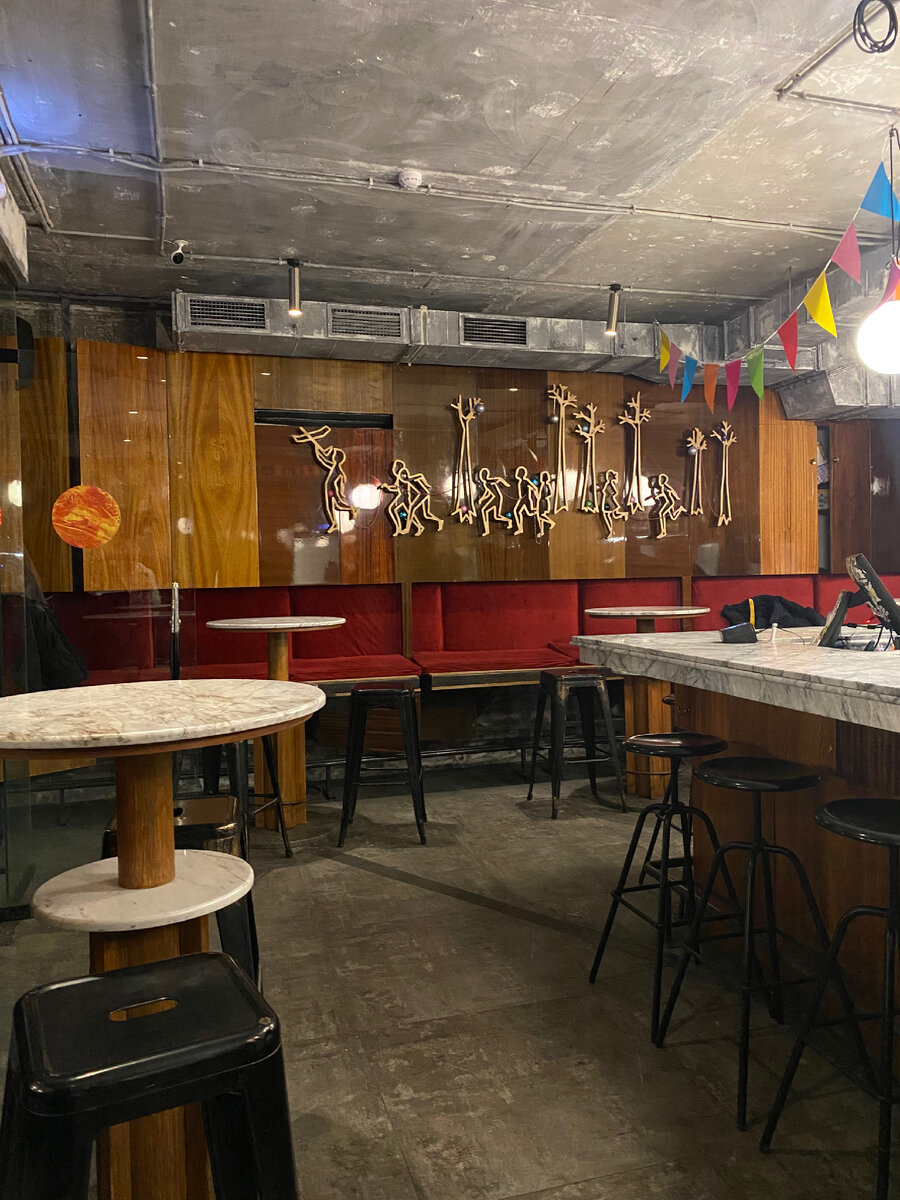 Дизайн места создает ощущение уюта: стены оформлены дверцами старых лакированных шкафов, а зеркала добавляют глубины. В центре стильно оформленный бар предлагает широкий выбор напитков. За барной стойкой трудится приветливая барменша, а на кухне мастерит блюда повар с бородой, чья харизма уже стала приметой заведения.