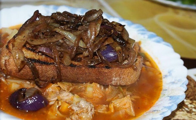 Для начала сварите насыщенный мясной бульон. Затем нарежьте лук кольцами и отложите 1-2 луковицы для гарнира. Обжарьте оставшийся лук на растительном масле, добавив немного соли, перца, тимьяна и щепотку сахара. Когда лук станет мягким, добавьте бальзамический уксус и уберите с огня.