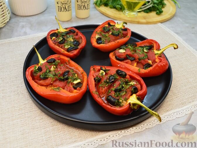 Закуска из запеченного болгарского перца с помидорами, маслинами и чесноком — это легкое и аппетитное блюдо, которое украсит ваш стол. Именно свежемолотый черный перец и ароматная зелень делают это угощение ещё более привлекательным.