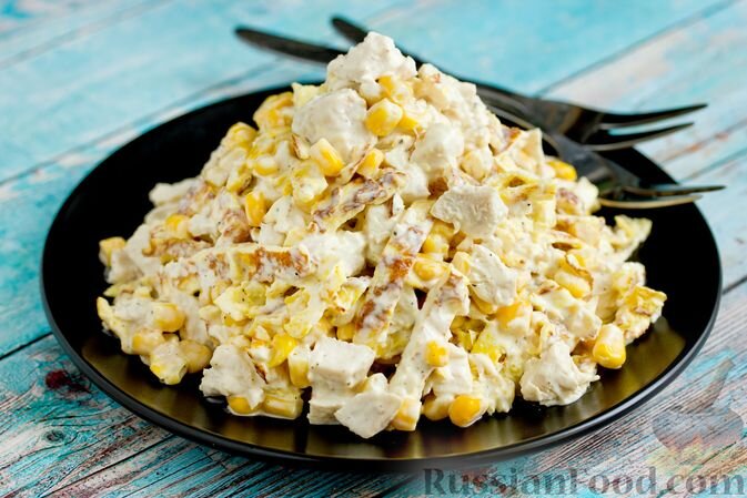 - Салат с курицей, кукурузой и яичными блинчиками: Нежный и питательный, этот салат удивит своей простотой и вкусом. Куриное филе, сладкая кукуруза и блинчики из яиц создают гармоничное сочетание.