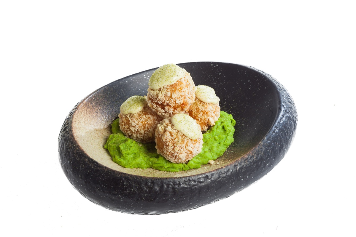 Для начала следует сделать овощной бульон. В 2 литрах воды отварите лук, морковь, сельдерей, петрушку и черный перец. Варите на среднем огне от 1 до 2 часов, затем остудите и процедите.Мелко нарежьте лук-шалот и чеснок, а затем обжарьте на оливковом масле до золотистой корочки. Добавьте рис и шафран, перемешайте.Влейте вино и готовьте 5 минут, потом добавьте бульон. Подготовьте рис до состояния аль-денте и смешайте с маскарпоне и пармезаном. Охладите для дальнейшей работы.Приготовьте сырную начинку, пробив в блендере моцареллу, горгонзолу и таледжо. Сформируйте из охлажденного риса небольшие шарики с начинкой, обваляйте в муке, яйцах и панировке.Разогрейте масло до 180 градусов и обжаривайте аранчини до золотистого цвета — около 3 минут. Для пюре доведите до кипения воду с мятой, добавьте горошек и варите 2-3 минуты. Пробейте в блендере с добавлением пармезана и масла. Храните в холодильнике.На тарелке выложите пюре и аранчини, украсьте майонезом с укропом для красивой подачи.