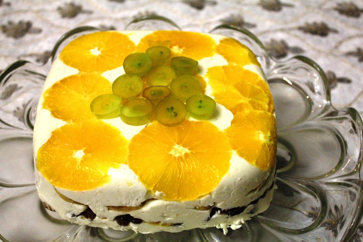 Очищенные апельсины и бананы нарезать на кружочки, а изюм промыть и замочить. Теперь пришло время собирать торт: выберите глубокую миску или форму.
