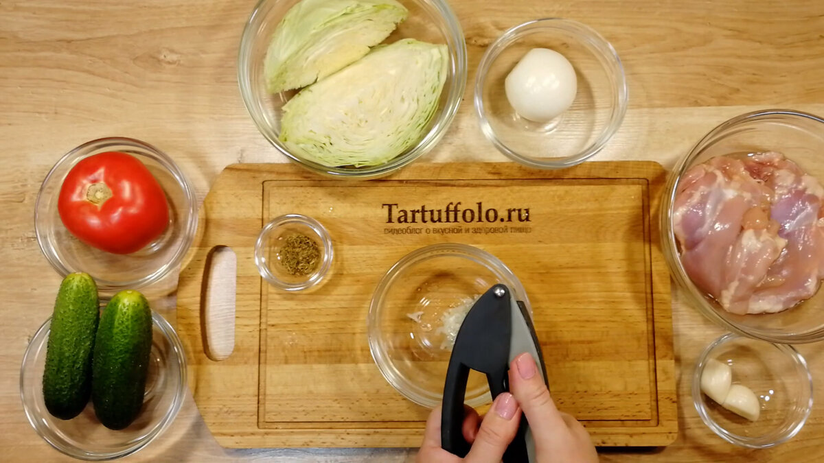 Начинаем с маринада для курицы. Для этого нужно выдавить 3-4 зубчика чеснока через пресс. В чеснок добавляют соль, черный перец, острый чили, чайную ложку сладкой паприки и половину чайной ложки зиры. Все тщательно перетираем, желательно в ступке, чтобы раскрыть ароматы специй.
