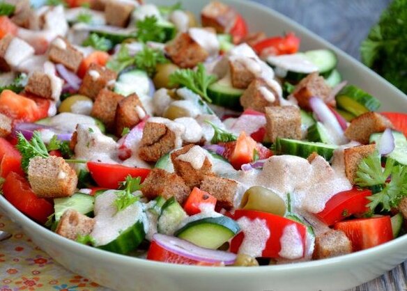 Сочный овощной салат с оливками и хрустящими сухариками