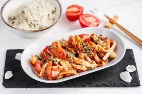 Шаг 2: Разогрейте сковороду и добавьте немного растительного масла. Положите в сковороду кальмары и обжаривайте их по 30 секунд с каждой стороны на сильном огне. Далее добавьте сладкий соус Чили, чеснок, помидоры, тимьян, маслины и каперсы. Все тщательно перемешайте и прогревайте еще минуту, пока не почувствуете возбуждающий аромат. Приправьте по вкусу солью и перцем. Подавайте на теплой тарелке, сбрызнув оливковым маслом. Блюдо готово к моментальному наслаждению!
