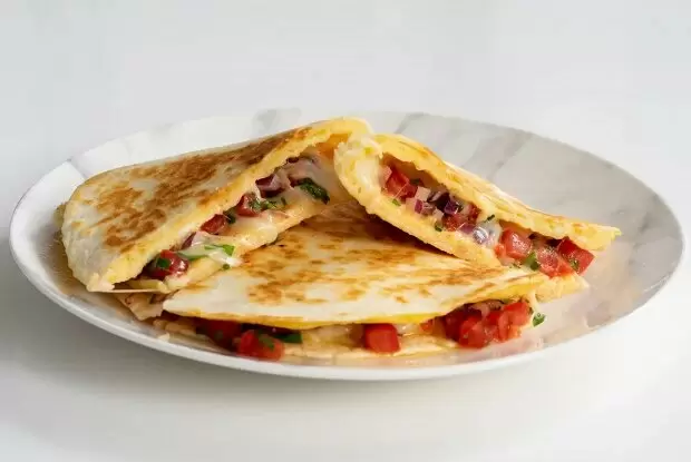 Подготовьте все ингредиенты, чтобы они были под рукой.Мелко нарежьте лук и зелень. Помидоры очистите от сердцевины и нарежьте маленькими кубиками.В объединенной посуде перемешайте нарезанные овощи с зеленью и немного добавьте паприки для аромата.Натрите моцареллу и чеддер на крупной терке.Взбейте яйца с добавлением соли до однородности.Разогрейте сковороду с растительным маслом и вылейте на нее взбитые яйца, чтобы получить омлет.Как только омлет подрумянится, осторожно положите на него тортилью и переверните, чтобы тортилья оказалась снизу.Посыпьте омлет тертым сыром и выложите на него овощную смесь.Сложите тортилью пополам и прогрейте на сковороде до тех пор, пока сыр не расплавится, а тортилья не подрумянится. Готовый сэндвич разрежьте и подавайте к столу немедленно.