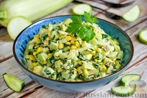 - Ингредиенты: зелёный консервированный горошек, черемша, твёрдый сыр, яйца, майонез, сметана, соль, перец.
