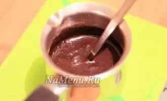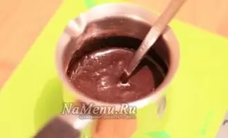 Начните с приготовления зеркальной глазури, которая должна застыть минимум за 5-6 часов до использования. Для этого в маленькой миске разведите желатин в 30 мл сливок и дайте ему набухнуть. Затем в кастрюле смешайте сахар, какао, воду и остальные сливки, доведите до кипения, постоянно помешивая, и варите 1-2 минуты. В горячую массу добавьте желатин и перемешайте до однородности. Охладите глазурь в холодильнике.
