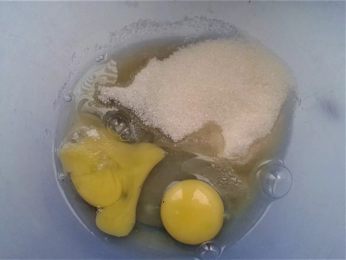 В глубокой миске взбить яйца с сахаром и добавлением соли до образования пены. Затем растопить масло, немного остудить и вылить его в тесто. Влить молоко, добавить муку с разрыхлителем и тщательно размешать, чтобы избежать комочков. Консистенция должна быть легкой и воздушной.