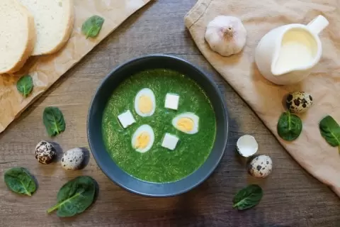 - В блендере соединить шпинат, обжаренные лук и чеснок, добавить бульон и сливки, а затем довести до однородного состояния.