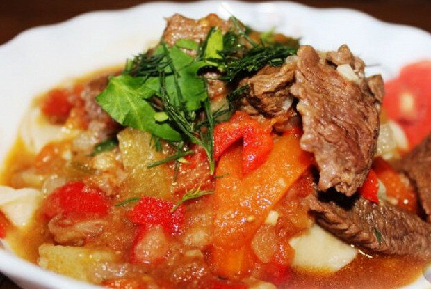1. Подготовка ингридиентов: Начните с того, что нарежьте говядину на кусочки среднего размера. Болгарский перец, помидоры и картофель также нарежьте крупными кусками, а лук – полукольцами, морковь – крупной соломкой.