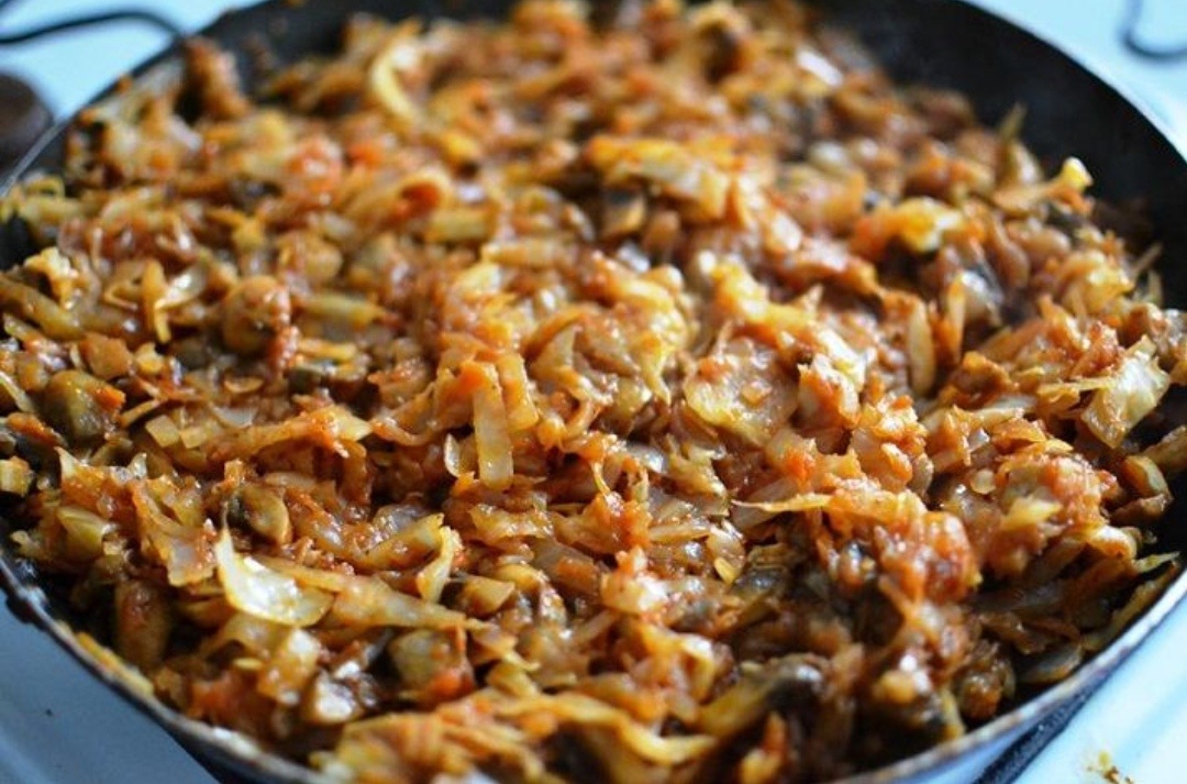 Грибы нарезать. Лук и морковь порезать соломкой. Обжарить все на сковороде, затем добавить капусту, специи и перемешать. Этот ароматный микс готовится в духовке при температуре 120-130°C в течение 1,5-2 часов. Подавайте, посыпав зеленью!