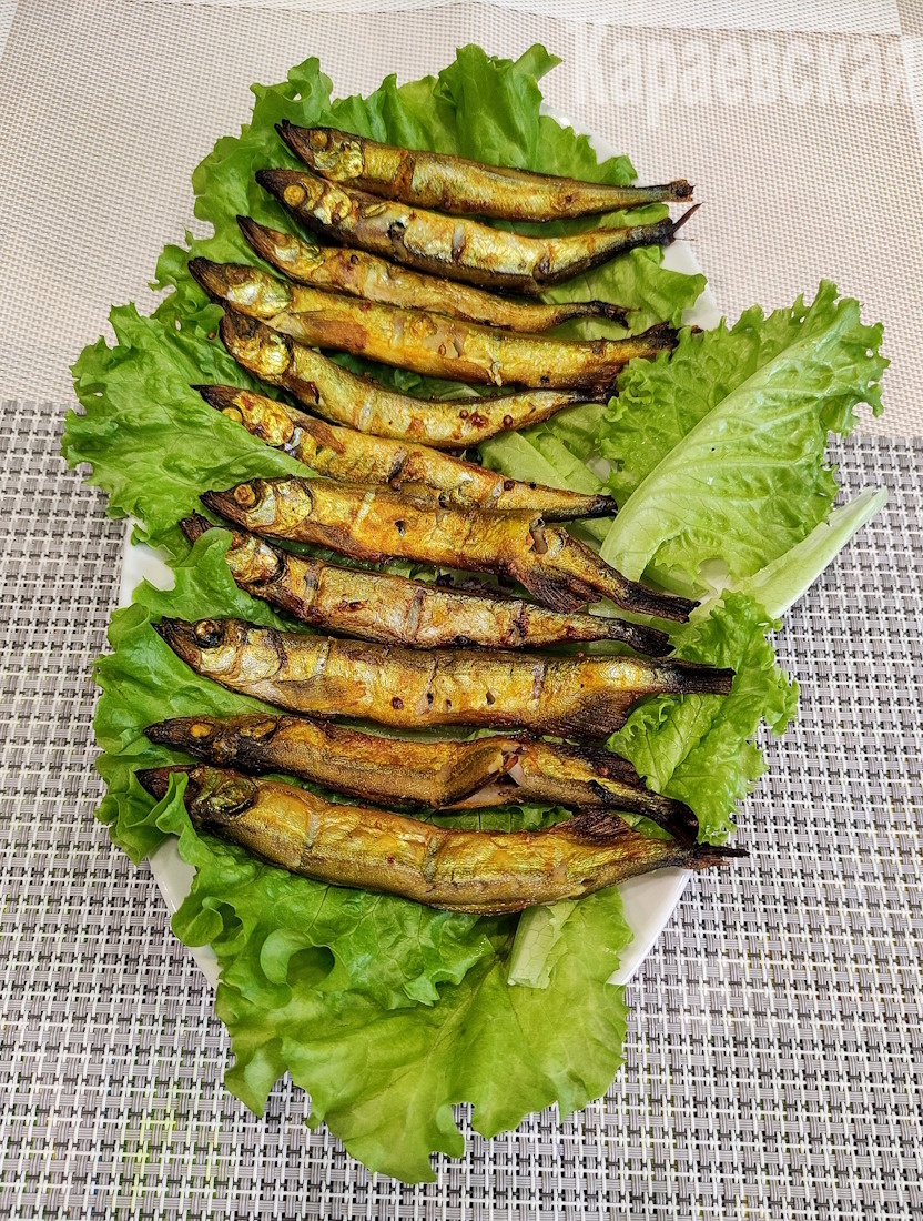 Когда пора запекать, выложите маринованную мойву на решетку и отправьте в предварительно разогретую духовку. Запекайте в течение 20-25 минут при температуре 180-200 градусов. Как только рыбка будет готова, украсьте ее листьями салата. Это не только добавит ярких красок на тарелку, но и разнообразит подачу.
