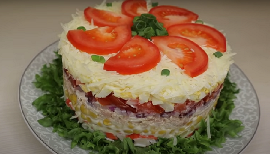2. Слои салата: Нарежьте крабовые палочки кубиками и уложите их вторым слоем, затем снова добавьте майонез. Выкладывайте кукурузу, разминаемый тунец и снова майонез. Лук нарежьте тонкими ломтиками и замаринуйте, если хотите, или уложите свежим слоем, смазывая майонезом после каждого слоя.