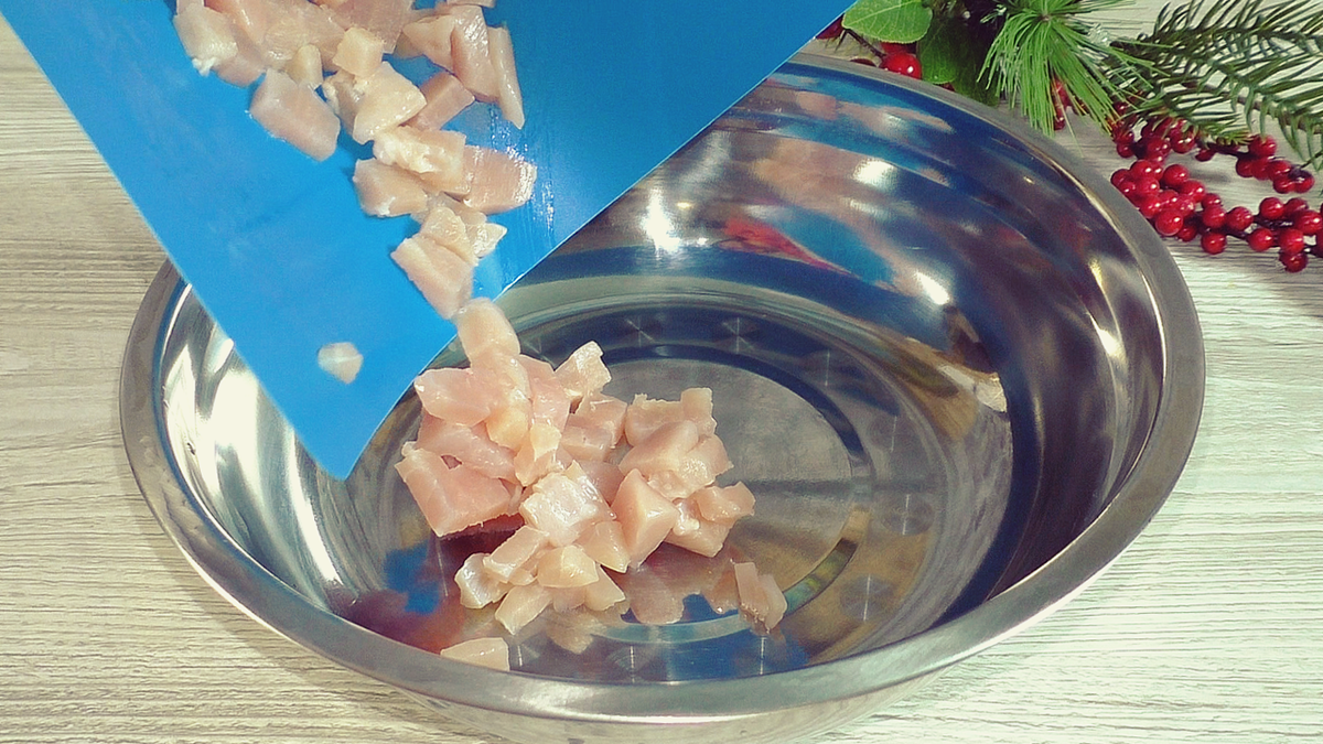 Начинаем с нарезки куриного филе на мелкие кусочки и помещаем их в миску. Немного подсаливаем и добавляем специи – оставляем мариноваться, пока готовим овощи.